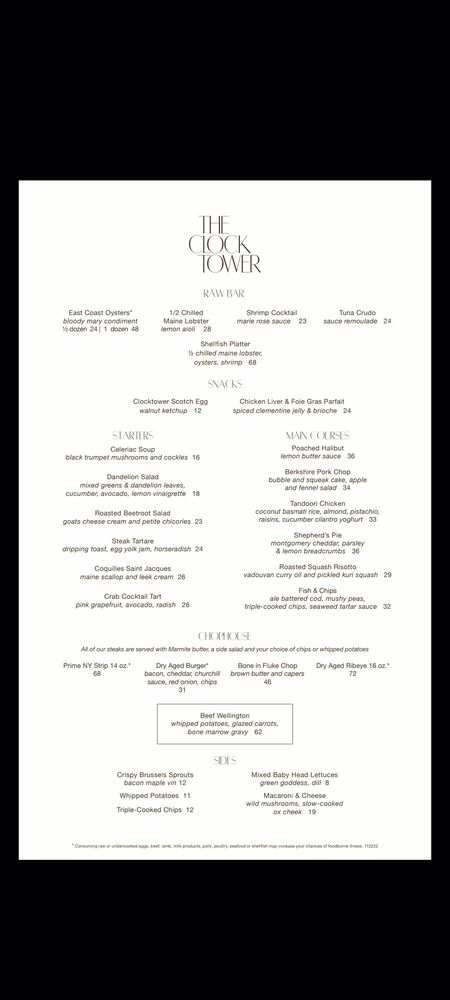 Introducing the menu at The Clocktower, located at 5 Madison Avenue in New York, offers a diverse array of delectable dishes. From classics like Aged Cheddar Cheese And Smoked Ham Omelette to upscale favorites like Brioche French Toast with smoked bacon, maple syrup, The Clocktower's menu is sure to delight your taste buds. Their impeccable service and inviting ambiance make for a memorable dining experience. The highlight, according to reviews, is the perfectly cooked Beef Wellington, bursting with flavor. The Scottish egg and fish and chips are also highly recommended. The fusion of Indian flavors in their sauces adds a unique twist to traditional dishes. With prompt service and well-paced dining, The Clocktower promises a leisurely yet satisfying meal that will have you coming back for more.
